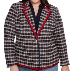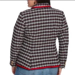 Infuse your wardrobe with a touch of collegiate charm. The Court & Rowe Checkered Blazer features a timeless plaid and red trim pattern electrified by bold red grosgrain trim along the lapels and hem. Finished with a single gold-tone crest button, this tailored piece is the ultimate “cool girl” take on classic academic style.