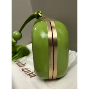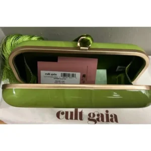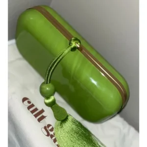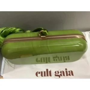 Make a grand entrance with the Cult Gaia Small Yasmin Clutch. Known for their architectural design, Cult Gaia has designed the Yasmin as an elegant pill-shaped accessory that fits perfectly in the palm of your hand. This version is rendered in a vibrant high-gloss Chartreuse (Lime Green) finish that captures the light and commands attention. The bag’s standout feature is the oversized, tonal silk tassel that hangs gracefully from the wristlet strap adding a sense of movement and drama to your evening look. Whether you’re attending a spring wedding, a gala, or a high-end dinner this clutch provides a sharp contemporary edge to traditional formalwear.